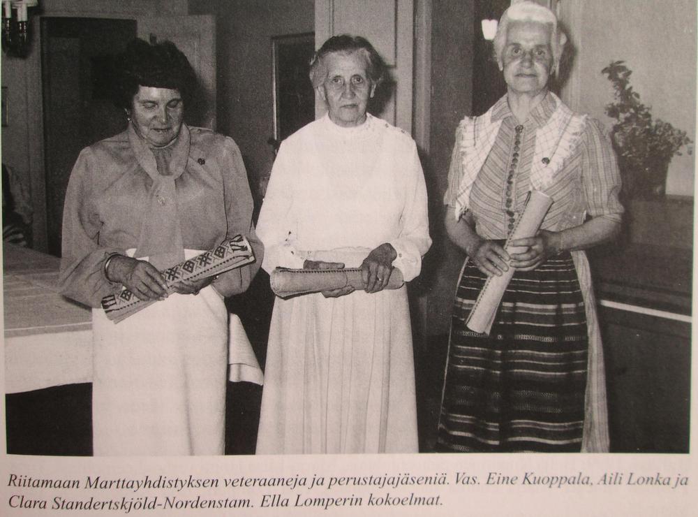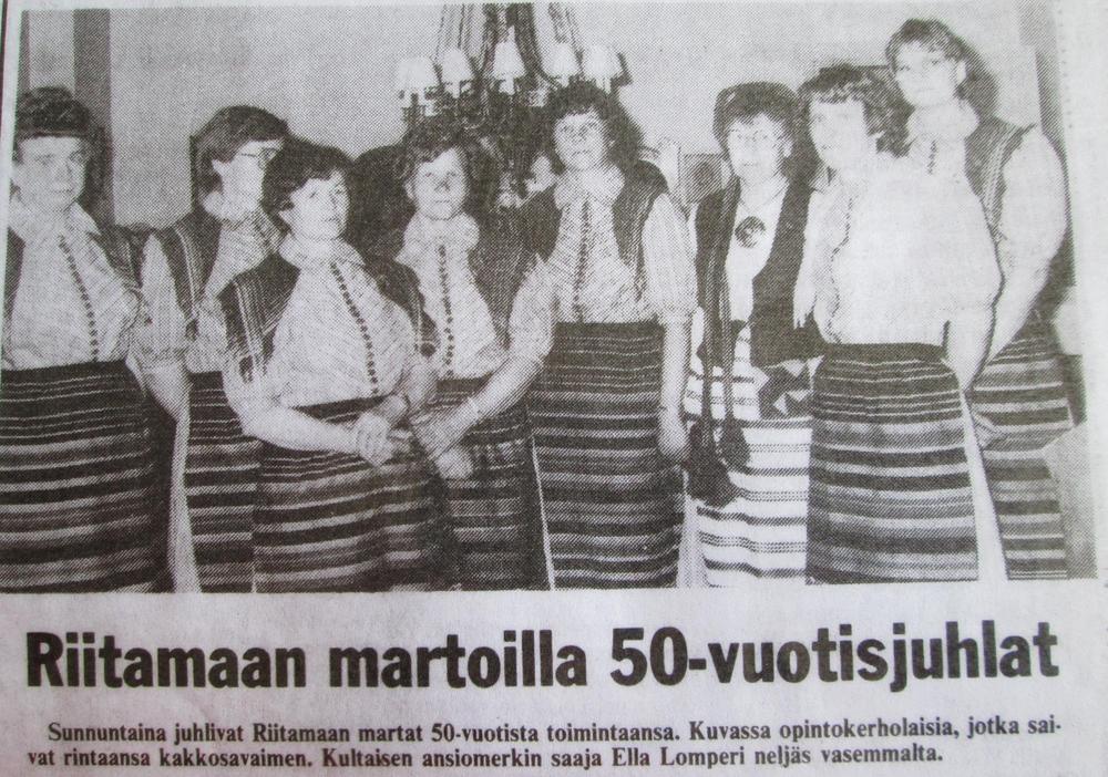 Ella Lomperi on ollut Riitamaan marttayhdistyksen kantavia voimia. Puheenjohtajakauden lisäksi hän toimi sihteerinä 35 vuotta ja myöskin piiriliiton hallituksessa. Juhlassa Ellalle luovutettiin kultainen ansiomerkki pitkästä työrupeamasta.